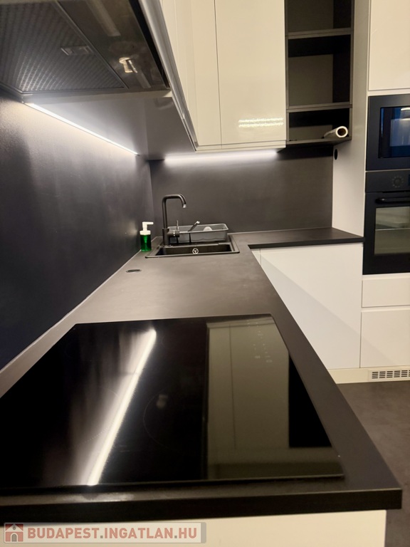 A konyha különösen figyelemreméltó: minőségi konyhabútor, praktikus elrendezéssel, beépített gépekkel (sütő, főzőlap, mikró, mosogatógép), amely így azonnal használatra kész.