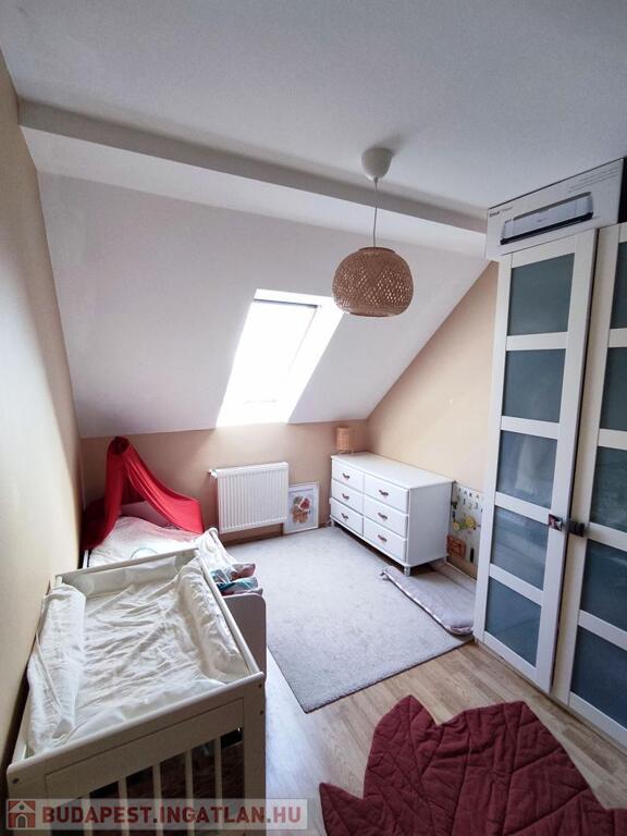 A lakás a harmadik emeleten található, három ízlésesen berendezett hálószoba, egy tágas amerikai konyhás-nappali és két nagyméretű fürdőszoba áll rendelkezésére a leendő tulajdonosnak a mindennapok eltöltéséhez. Az egyik fürdőszobában beépített kád, a másikban zuhanyzó, minőségi burkolatok és szaniterek találhatók. A szobákban laminált parketta, a konyhában és a fürdőben hidegburkolatok funkcionálnak padlóként. A két erkélyről páratlan panoráma nyílik a Gerecsére, ahol kipihenheti a hétköznapok fáradalmait. A magasfényű IKEA-s konyhabútor praktikus kialakításával, beépített gépekkel, indukciós sütővel és páraelszívóval élménnyé fogják tenni a konyhában töltött időt. A nyílászárókon redőny található, Velux árnyékolóval és szúnyoghálóval felszereltek. A tetőtér 20 cm-es gyapot, tükörfóliás szigetelést kapott, valamit egy hűtő-fűtő klíma is beszerelésre került, ami még kellemessebbé teszi a hőérzetet a téli és a nyári időszakban egyaránt.