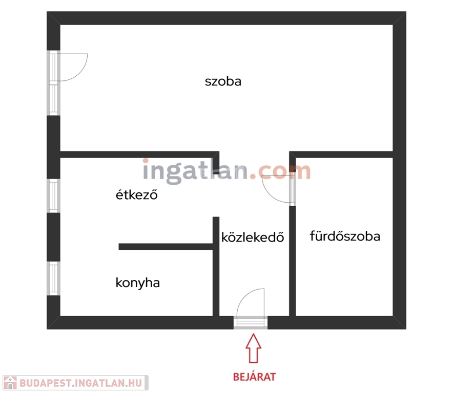 - a tágas, francia erkélyes szobán túl találunk a lakásban egy konyhát, étkezőt, sarkokkádas fürdőszobát (egyben a WC-vel), valamint egy közlekedőt