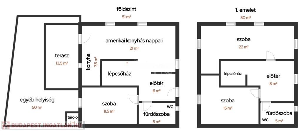 Az emeletre egy kényelmes fokkiosztású stabil lépcsőn juthatunk fel a felső szintre, ahol 8nm-es előtér vagy közösségi tér, kettő egyenként bruttó 22, illetve 15nm nagyságú klimatizált szoba, valamint az 5nm-es kádas fürdőszoba helyezkedik el.