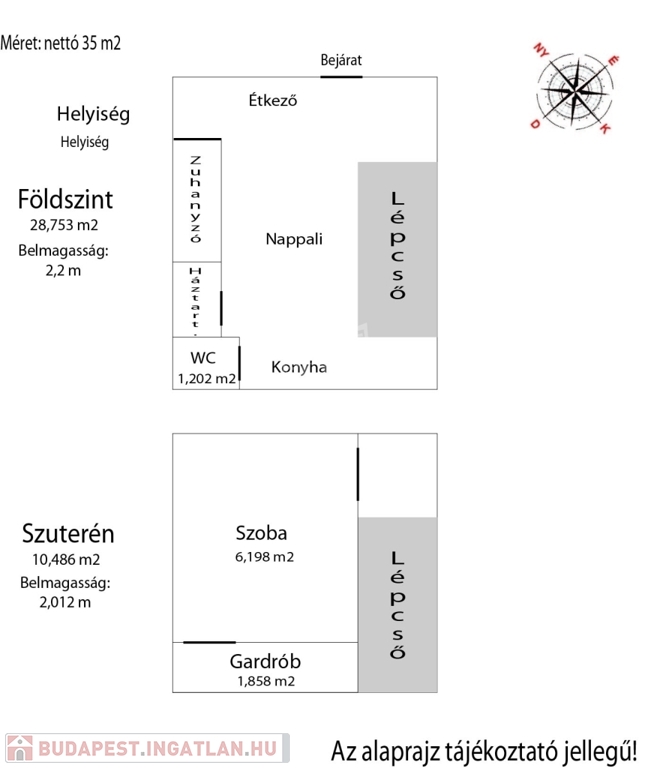 Az ingatlan két szintes, a felső szint 28,753 m2, és alatta található még egy szuterén (10,486 m2) helyiség, megosztva, jelenleg szoba és egy gardrób.