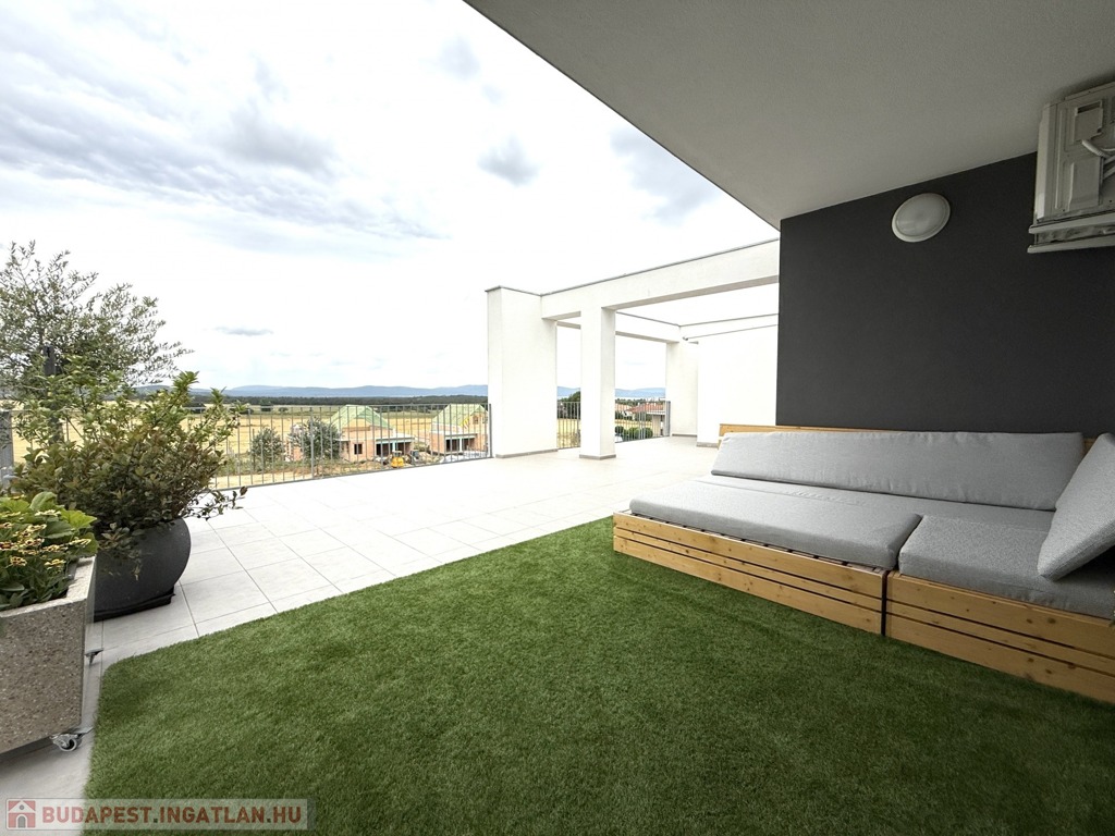 Ez a 2019-ben épült, napfényes penthouse nemcsak lenyűgöző, hanem otthonos is: 88 m² alapterületéhez egy igazán tágas, 70 m²-es terasz tartozik, amelyről lélegzetelállító kilátás nyílik egy hatalmas zöldövezetre.