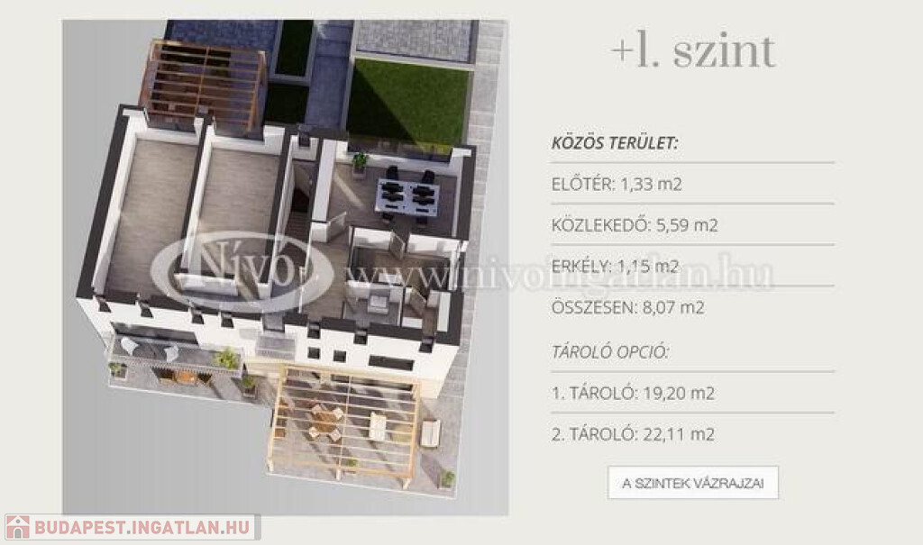 Az exkluzív kivitelezésű, három szinteltolásos társasházban (ikerház jellegű) 2 db belső kétszintes (egy 135,62 m2 és egy 97,88 m2) saját kertkapcsolatos lakás