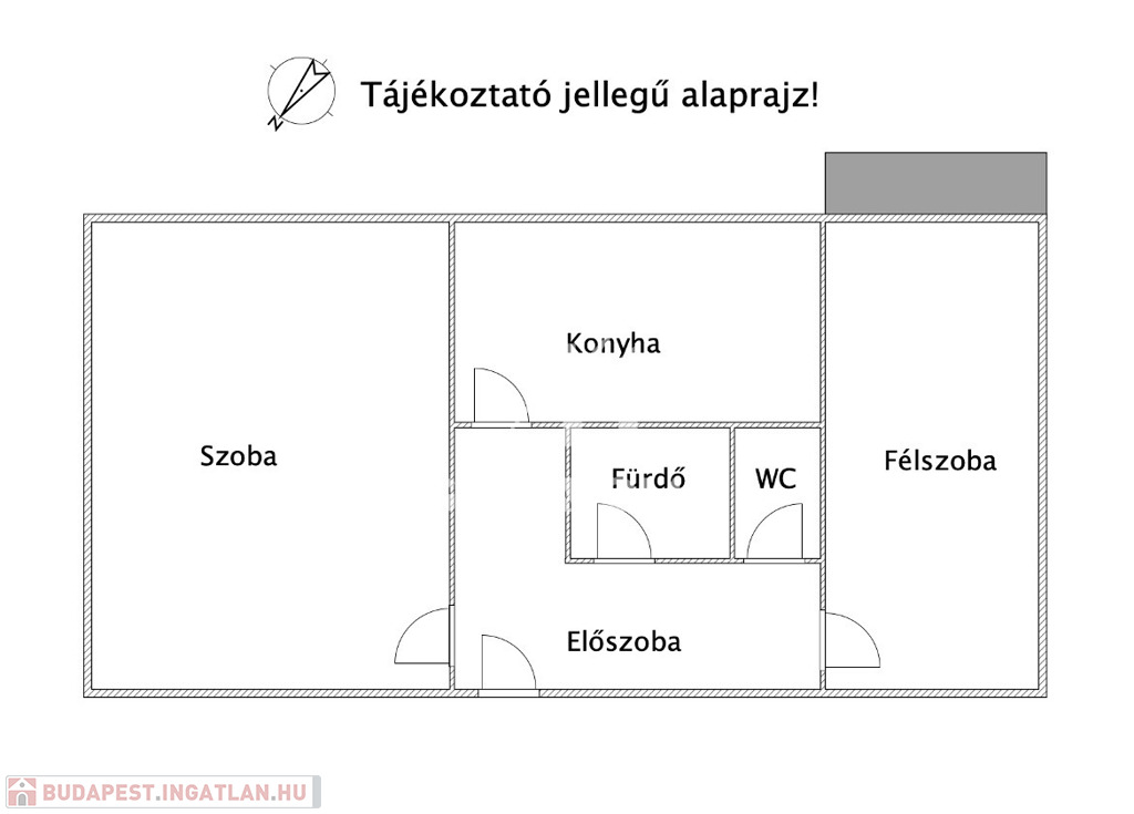 - 1 egész szobából, 1 félszobából, 1 előszobából, 1 konyha/étkezőből, fürdőszobából (zuhanyzós), és 1 különálló WC-ből áll.