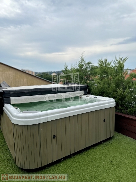 A lakás ékét, egyediségét jelentő, fantasztikus kilátással bíró teraszra több helyiségből is kijuthatunk, ahol a 7 személyes JAKUZZI is helyet kapott a kerti bútorok, a grillező és a focikapuk mellett, melyek mind a kellemes időtöltést biztosítják.