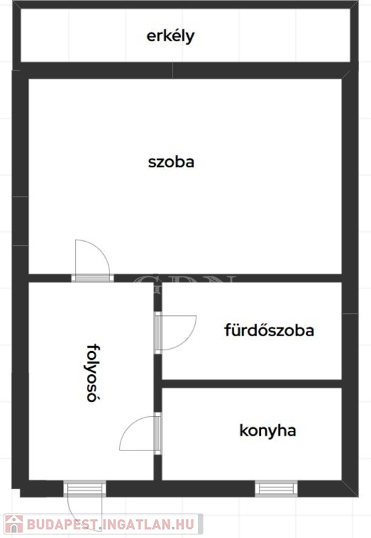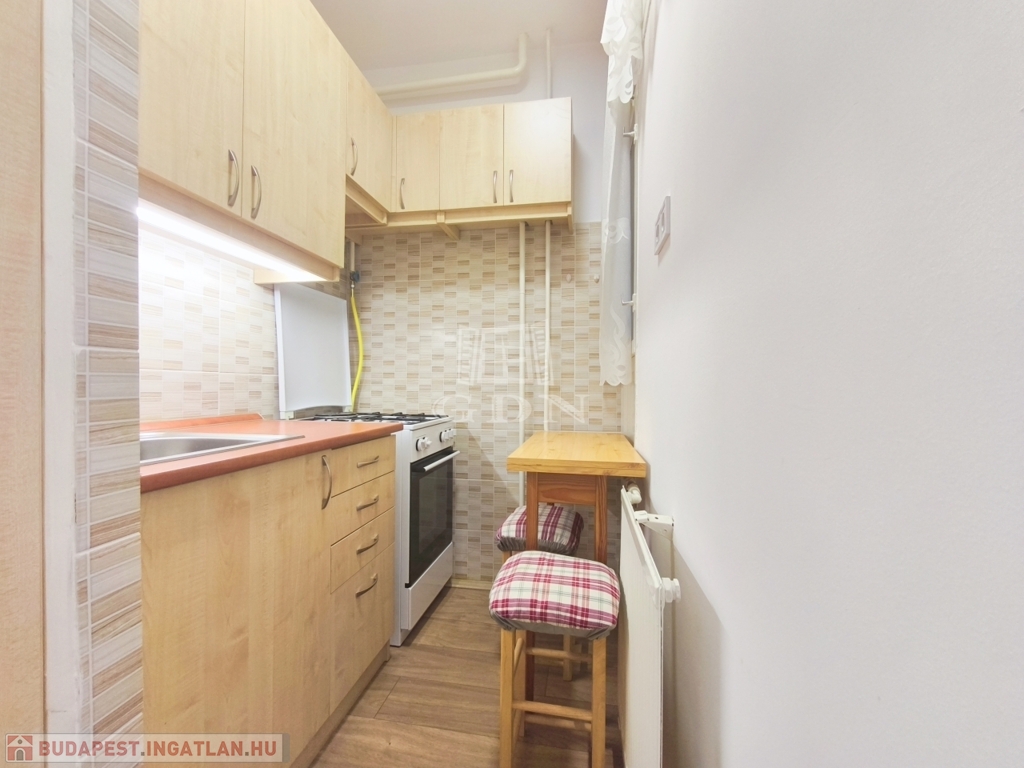 A lakás praktikus elrendezésű: a tágas, világos szoba erkélykapcsolattal bír, mely mellett külön konyha, valamint egy fürdőszoba került kialakításra.