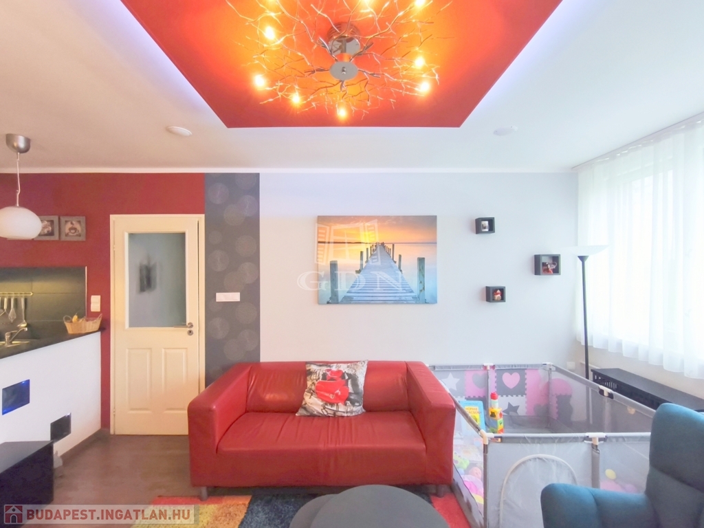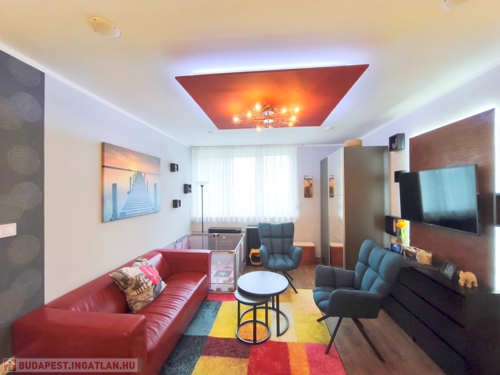 A lakás teljes egészében álmennyezet található beépített hangszórókkal és igényes, rejtett LED világításokkal, amelyek modern és hangulatos megjelenést adnak az otthonnak.
