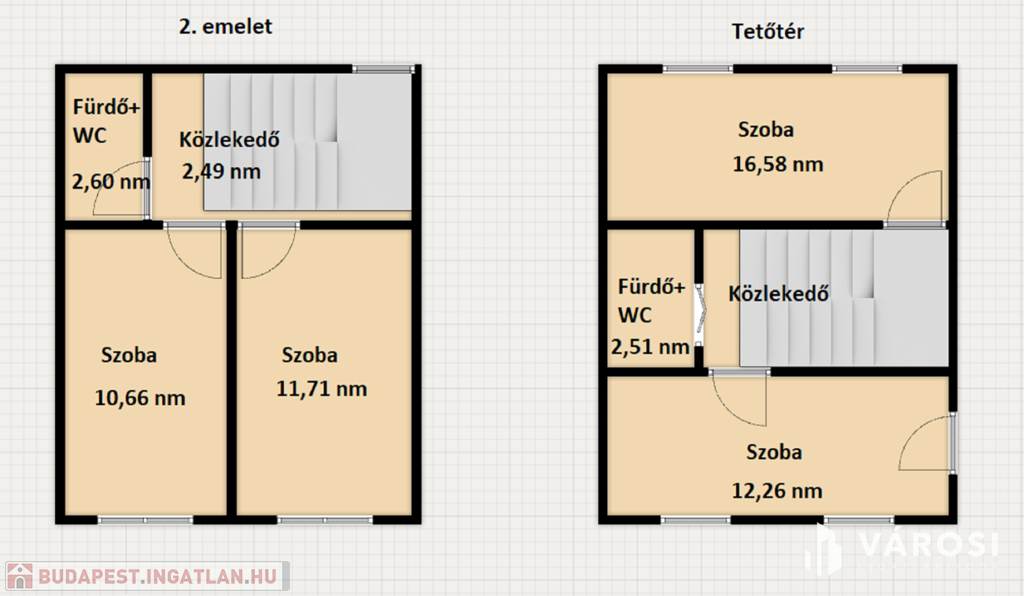 Az utolsó szinten, ami a beépített tetőtér, szintén található kettő szoba, az egyik 17 nm a másik 12 nm nagy, ezekhez is tartozik egy zuhanyzó+ WC.