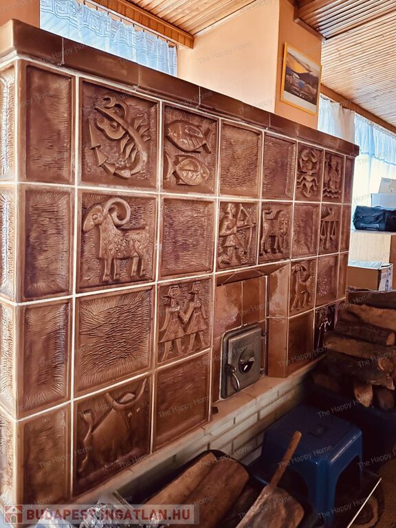 melynek közepén egy különleges cserépkályha teremti meg az otthon meleg, karakteres hangulatát.