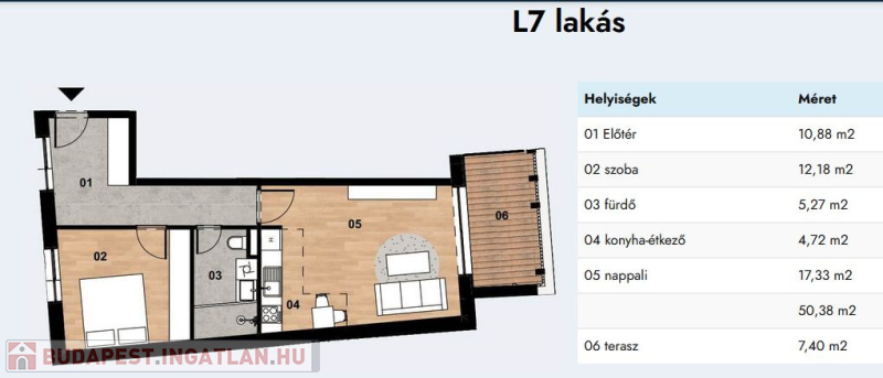 - 50,38 négyzetméter, alacsony energiaigényű, 7,40 négyzetméteres terasszal