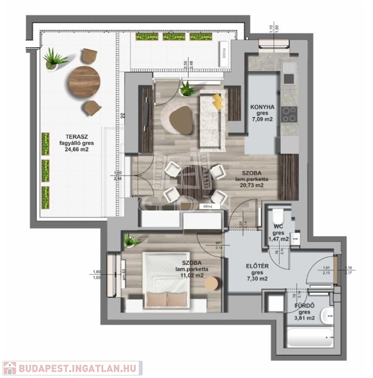 - nagy méretű, 24,66 m2-es terasz