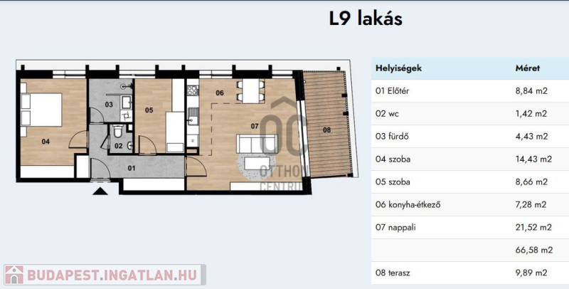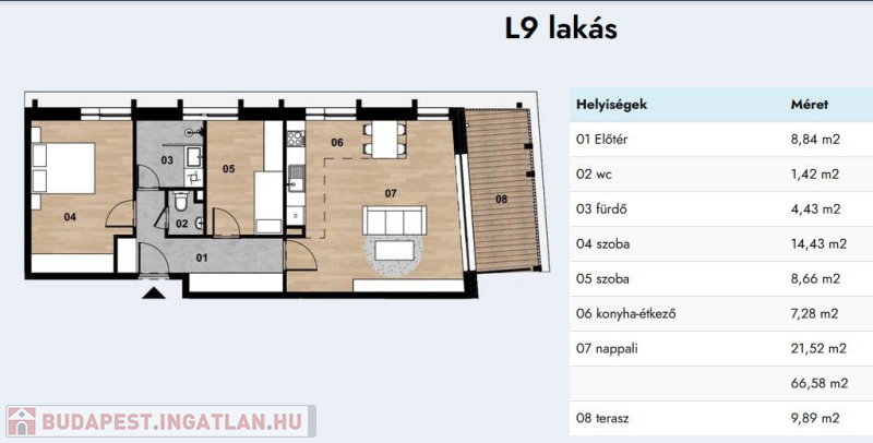 - 66,58 négyzetméter, alacsony energiaigényű, 7,40 négyzetméteres terasszal