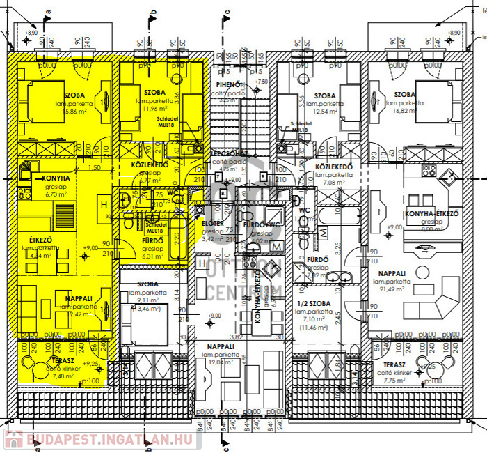 2 hálószoba, nappali, konyha, étkező, fürdő, 2 WC, előtér, közlekedő, terasz elrendezésű.