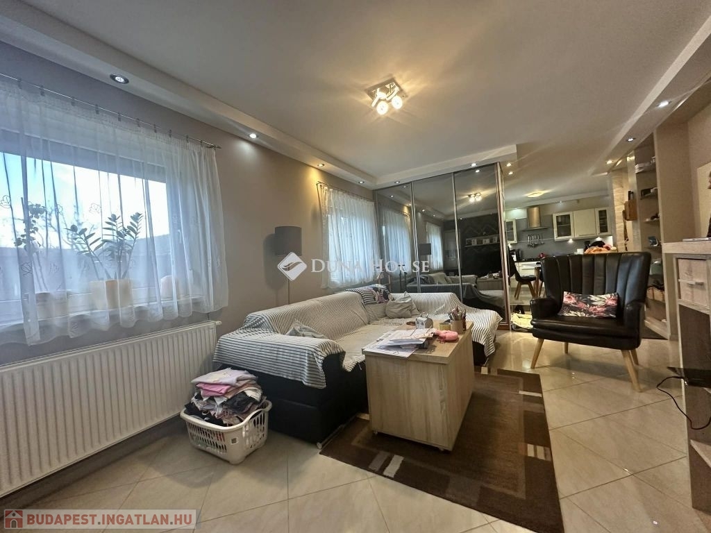 Az ingatlan alsó szintje közvetlen kertkapcsolattal rendelkezik, az udvarról is megközelíthető. Itt található egy modern konyha étkezővel, fürdőszoba+ WC, valamint egy tágas világos nappali.