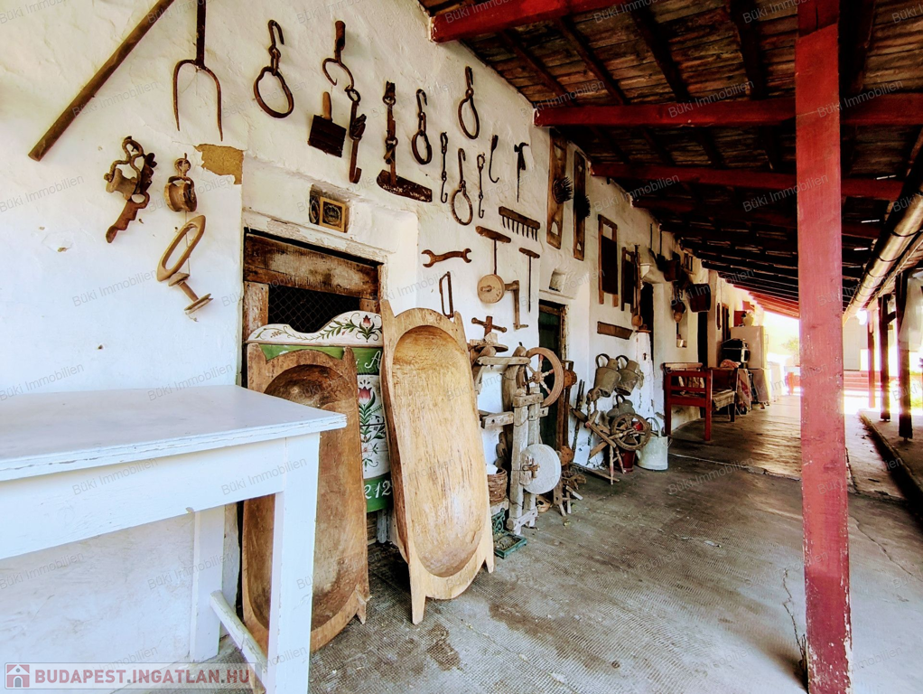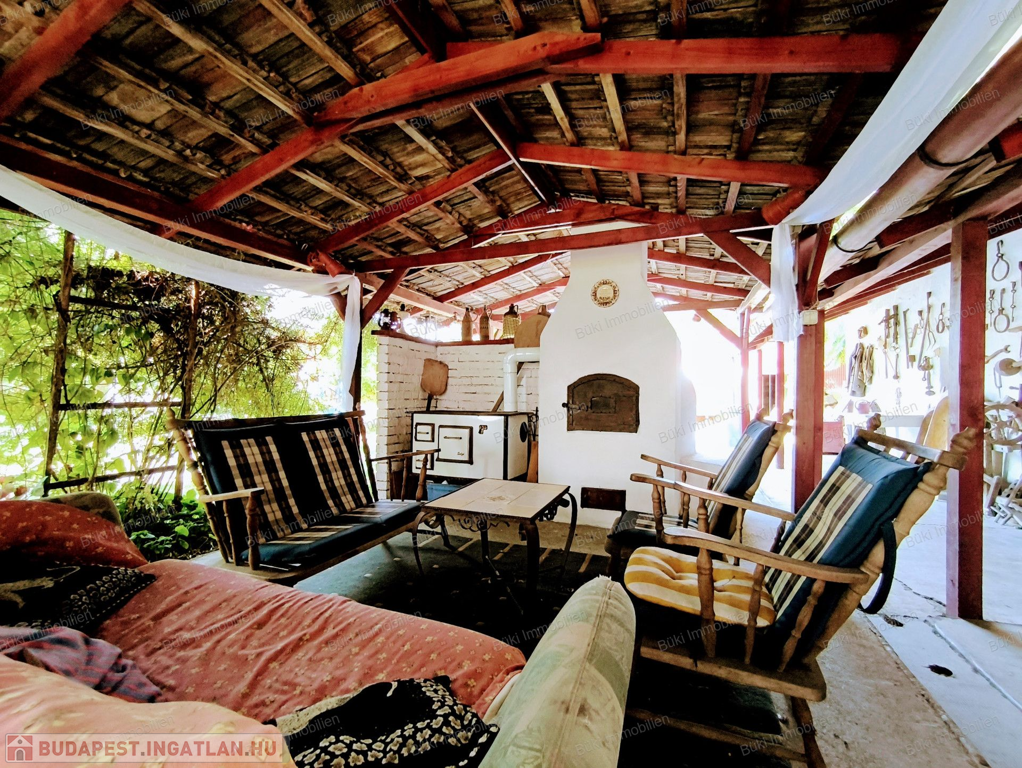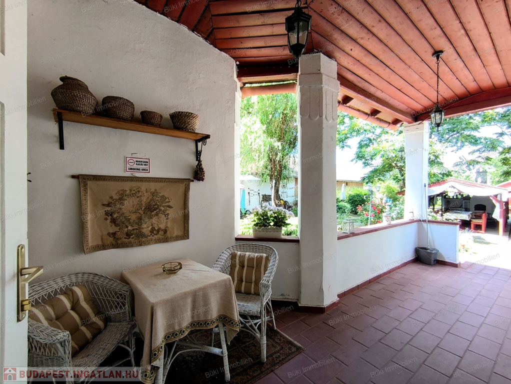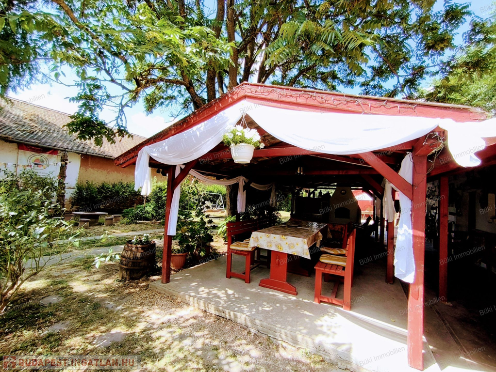 Az udvar igazi vidéki oázis: az ízlésesen parkosított, 3200 m²-es telek árnyékos fákkal, gondozott pihenősarkokkal és barátságos zugokkal várja az itt megszállókat vagy éppen a rendezvények vendégeit. A loggiával kiegészített főépület mellett igazi kincs a különálló nyári konyha – hagyományos cserépkályhával felszerelve – ahol öröm a főzés. A filagória és a kemence melletti tér ideális helyszín egy családi vagy baráti grillezéshez, borozgatáshoz, meghitt beszélgetésekhez. A hidegebb hónapokra is gondoltak: a kert végében különálló szauna biztosítja a testi-lelki feltöltődést.