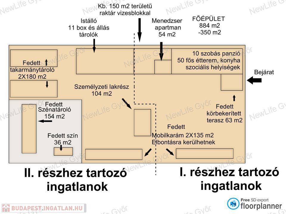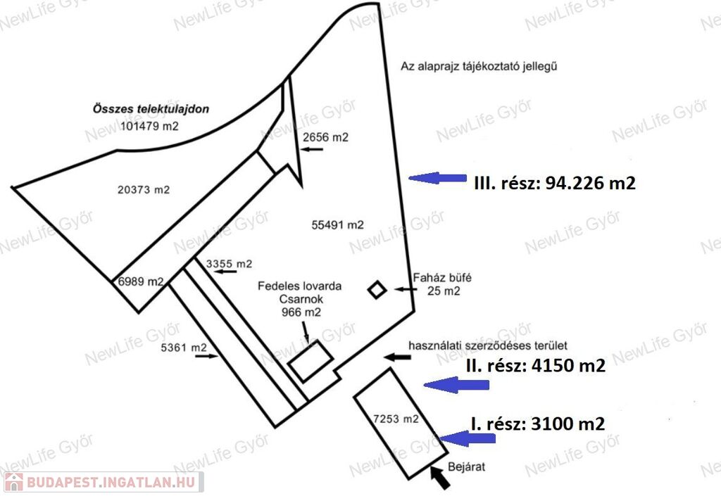 II. rész irányára: 194 MFt, mely tartalmazza a főépület végét, kb 350 m2-nyi, 11 boxot és állást, tárolókat, 2*180 m2 fedett takarmánytárolót, 154 m2 fedett szénatárolót, 34 m2 méretű fedett színt és egy személyzeti komplett lakrészt 104 m2en. A főépülettel szemben található (másik) 135 m2 területű fedett mobilkarám, mely szükség esetén bontható, vagy autóbeállók alakíthatók ki belőle.