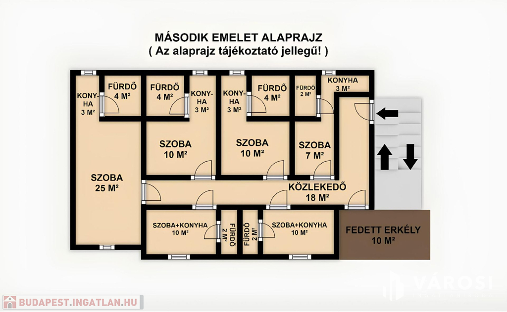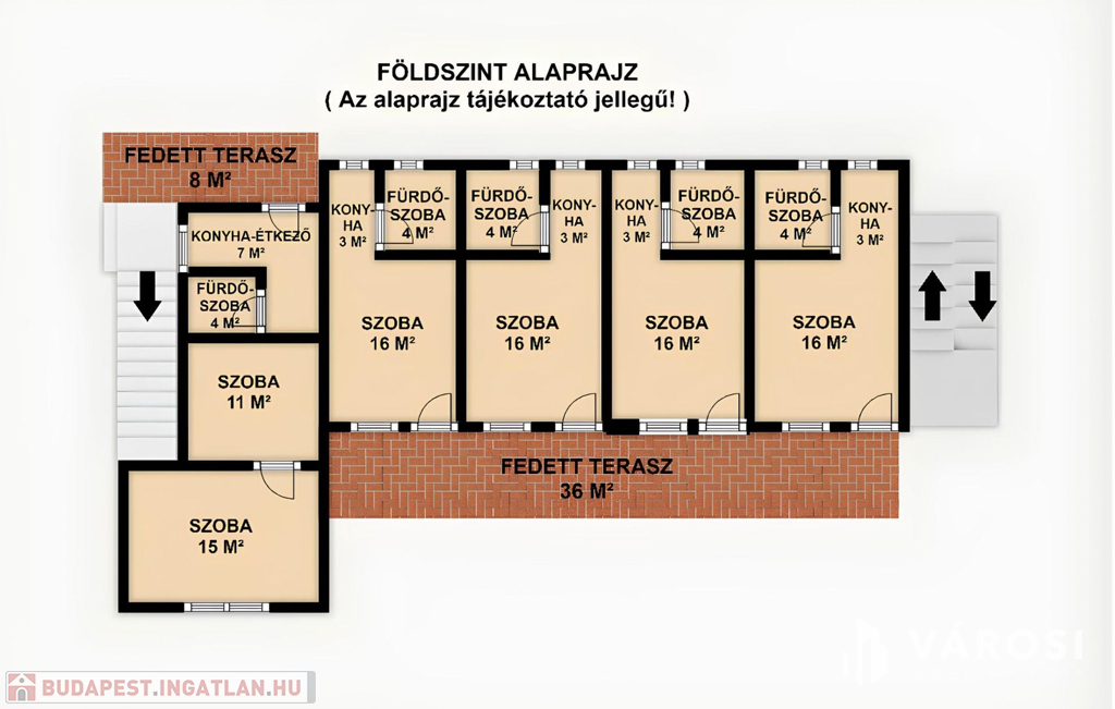 Az apartmanok elrendezése lehetővé teszi a tulajdonosnak és/vagy a gondnoknak is az állandó ott tartózkodását, mivel 2 apartman a ház egyik oldaláról közelíthető meg, míg a többi 13 a ház másik oldaláról, így azok elszeparáltan használhatóak. A ház alatt egy nagy 25 m2-es pince található, mely jelenleg gépészeti helyiségként valamint műhelyként funkcionál.