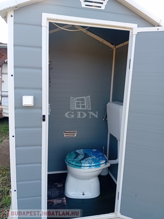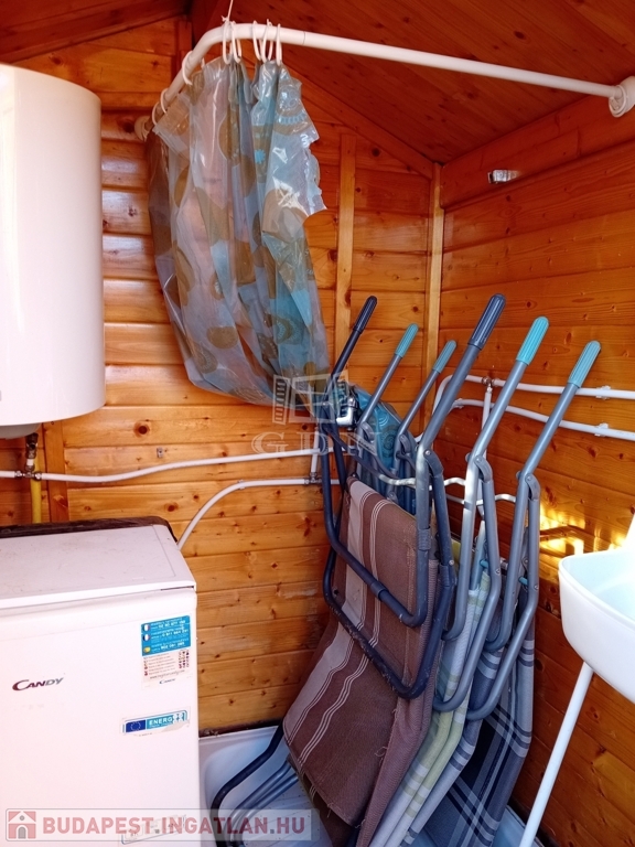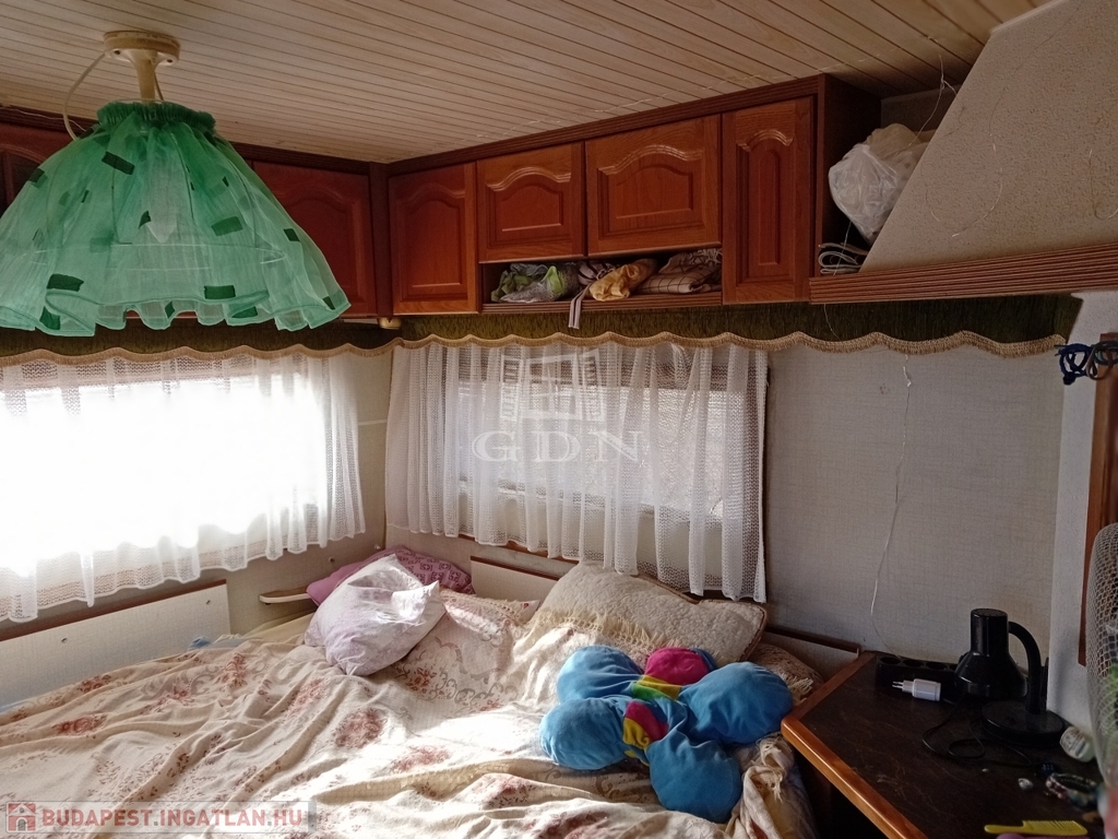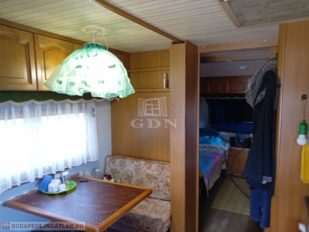 - 50 m²-es fatetőszerkezet, lemeztetővel, alatta 20 m²-es lakókocsi (5 férőhelyes) hangulatos fabútorokkal, kis konyhával