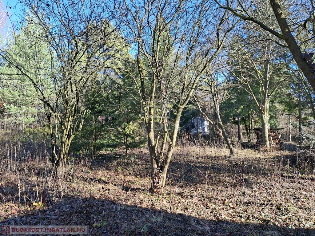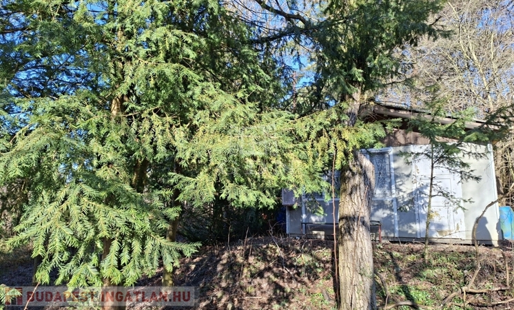 A telek zöld, a növényzet természetes, valamint van rajta egy barátságos kis ház, tárolóval.