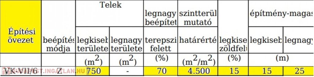 Beépíthetőség: 80%, Minimum zöldterület mértéke 15%.
