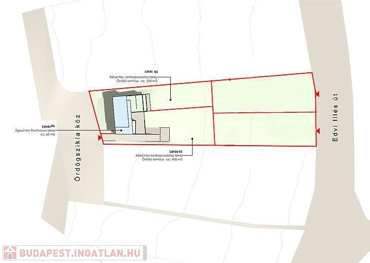 A telekhez készült látványterveken a felső, 3 lakásos ház tartozik a szóban forgó telekhez.