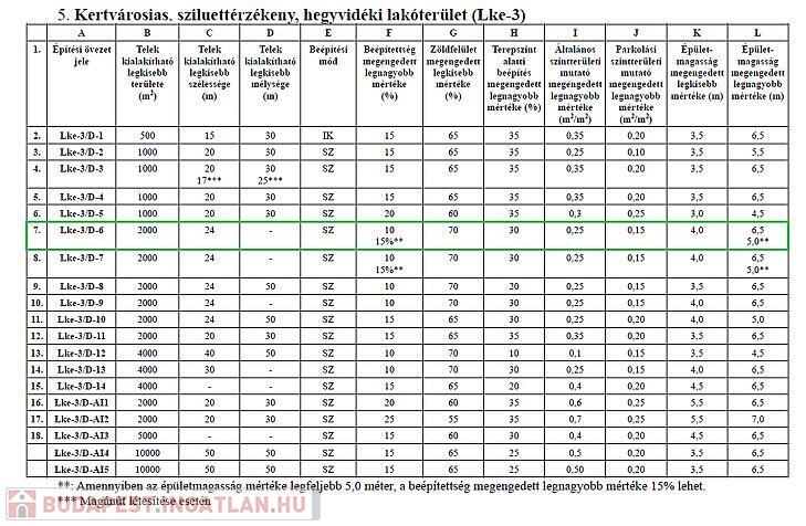 A telek besorolása Lke -3/D-6, 15% -os beépíthetőséggel és 0,25 - ös szintterületi mutatóval, az engedett építménymagasság 6,5 m.