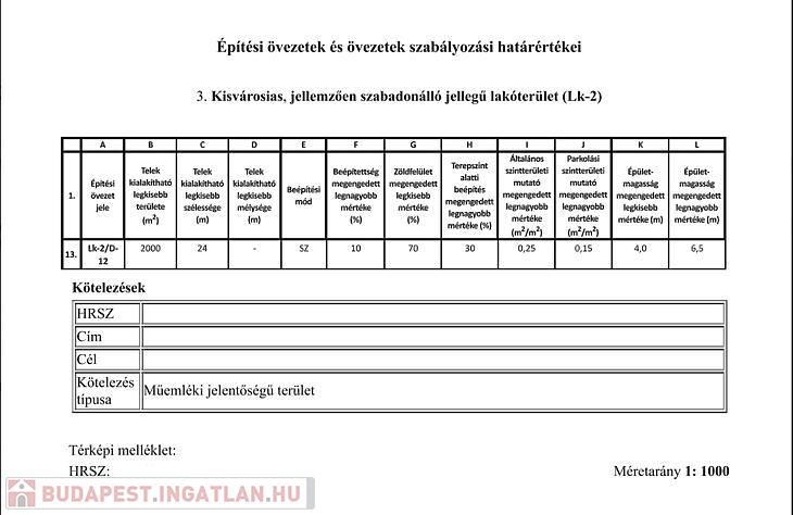 A telek besorolása LK-2/D-12, mely beépíthetőségi mértéke 10%, szintterületi mutatója 0,25.