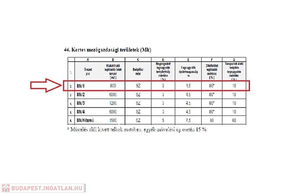A telek 3%-a beépíthető, a környék zöld nyugalmában már sok lakóház áll. Az építmény maximális magassága 4,5 méter lehet. Miután kiemelt zöldövezeti rész, így a zöldterületből 80%-ot meg kell tartani.