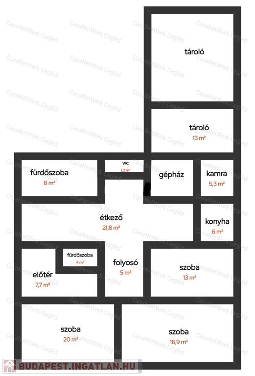 elhelyezkedő zártkertet. Az épület 117 m2 -es, elosztása: nappali, konyha, három szoba és kettő fürdőszoba, spájz, kazánház, előtér, folyósó.