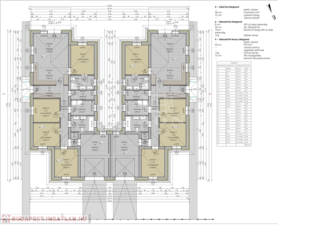 A terv minkét ikerfél esetében 128 m2-es, 4 külön hálószobával, amerikai konyhás nappalival, illetve két fürdőszobával és egy 19,8 m²-es garázzsal rendelkezik.