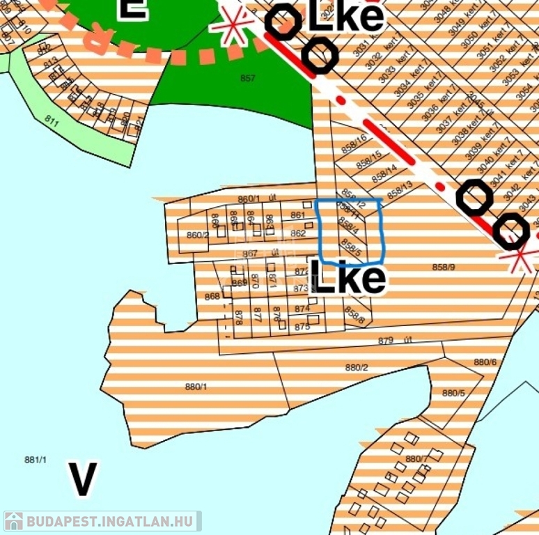 A V-es tó partjától 100 m távolságra található a 2 telek alapterülete: