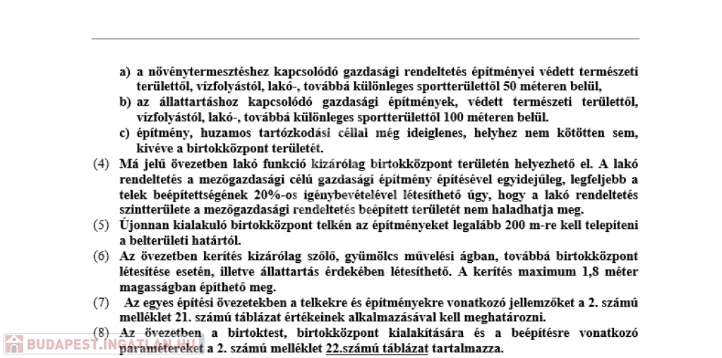 Újonnan kialakuló birtokközpont telkén az építményeket legalább 200 m-re kell telepíteni a belterületi határtól.