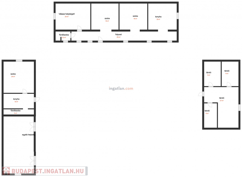 Ebben az épületben 3 nagy területű szoba, konyha, fürdő, és a már említett folyosó áll.