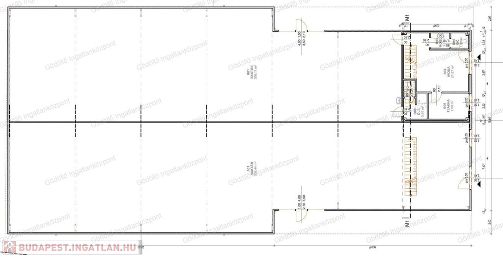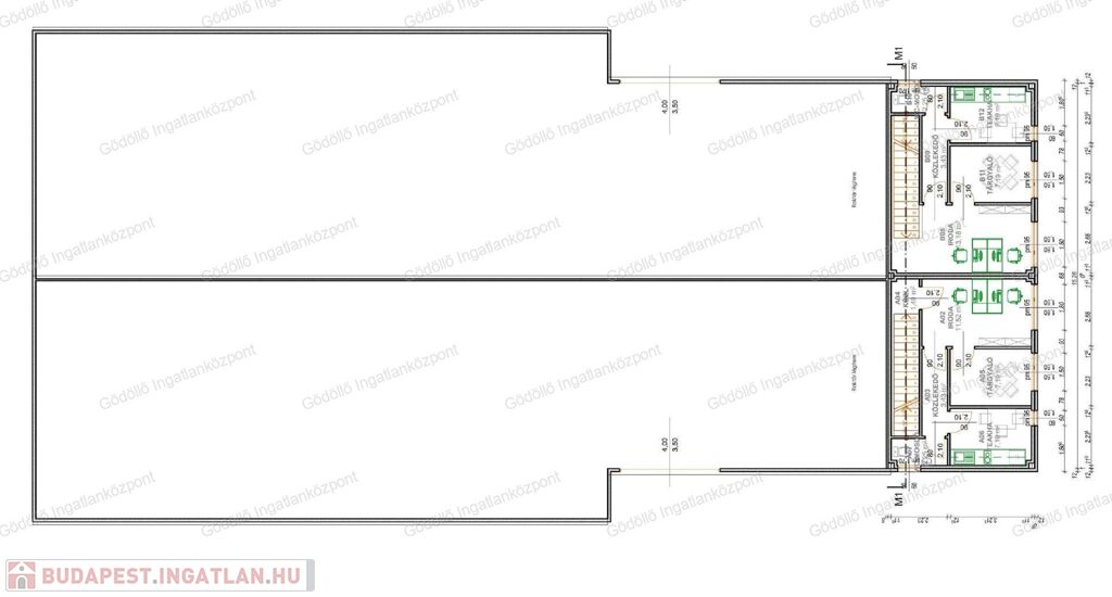 Raktár (300nm), a földszinten (36nm) és a galérián (36nm) is irodák, szociális helységek (wc, fürdő, öltöző, teakonyha) + telekrész 456m2