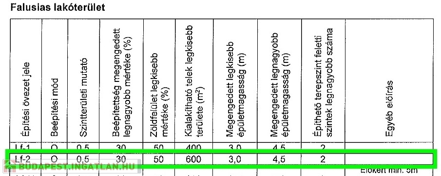 A telek "falusias lakóövezetben" helyezkedik el. Az övezetre jellemző, főbb beépítési paraméterek: