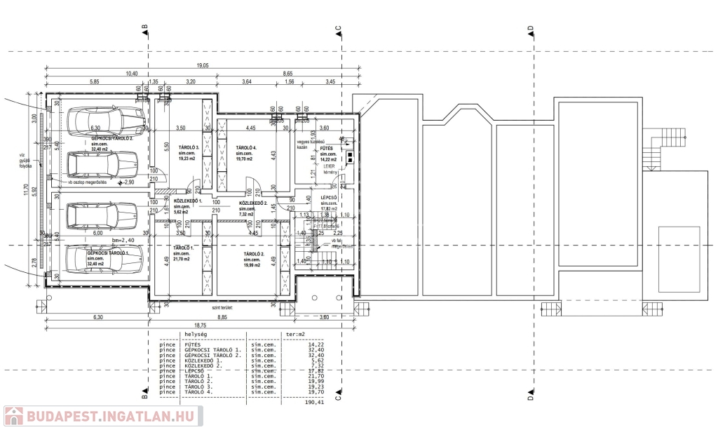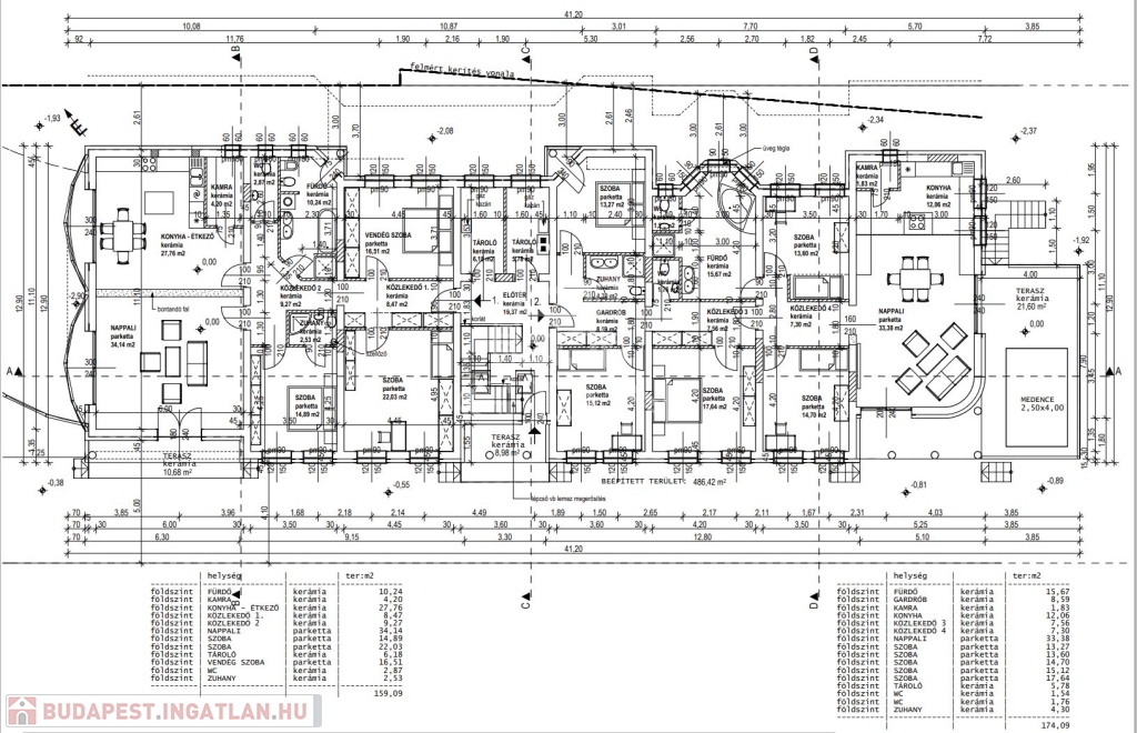 A lakások nettó lakóterülete 159 m2 és 174 m2, a pince szinten pedig mindkét lakás számára tároló helyiségek és garázsok lettek tervezve, melynek területe 190 m2.