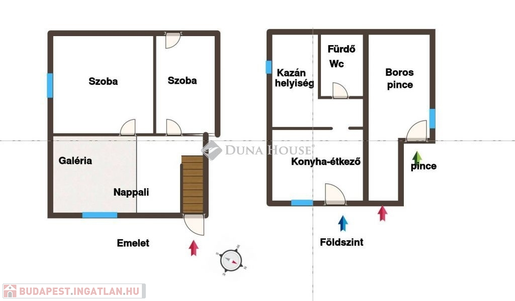 Az ingatlan földszinti részén kapott helyet a fürdő, a konyha-étkező és a kazán, külön bejárattal pedig a boros pince.
