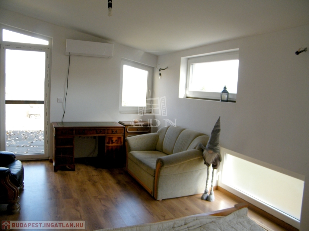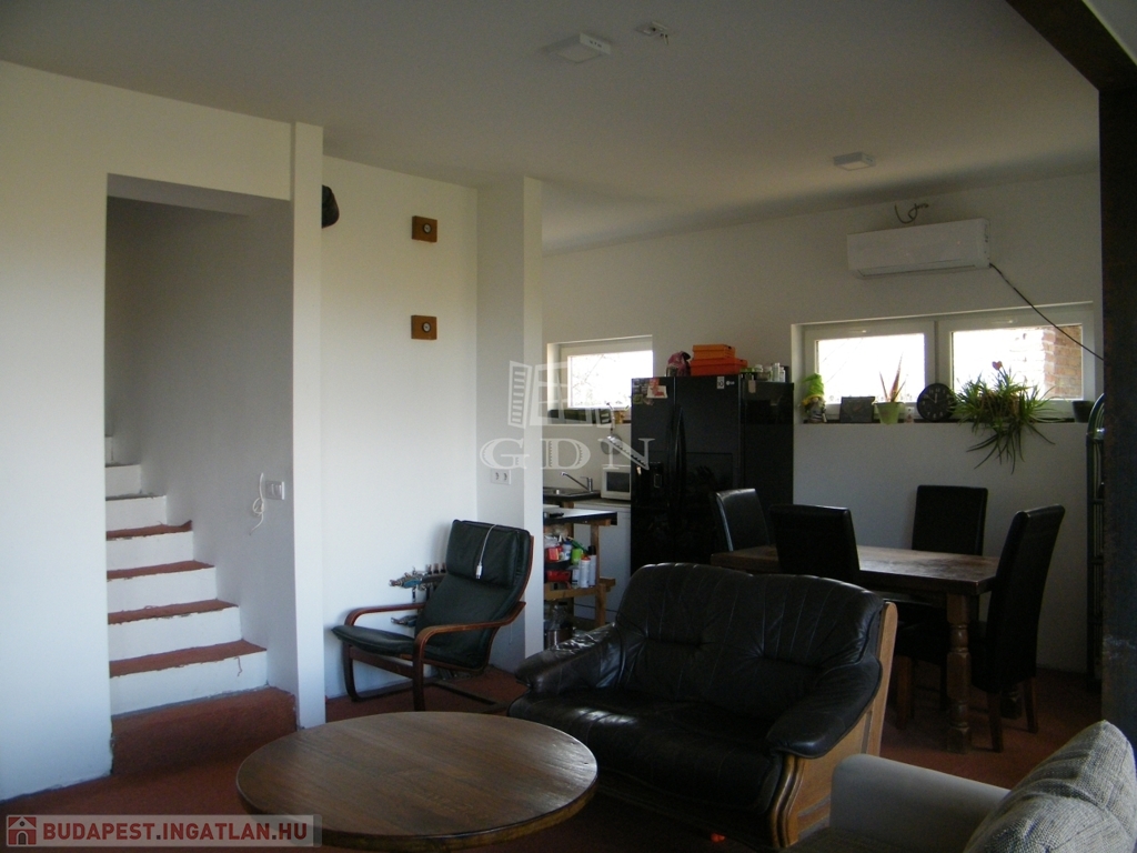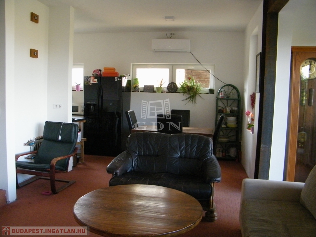 A kétszintes, 125 nm-es lakás és iroda épület helyiségei 4 szoba, két fürdőszoba, közlekedő terasz. Fűtés: padlófűtés faelgázosító kazánról, 2 hűtő-fűtő klíma; kandalló kémény kiépítve.