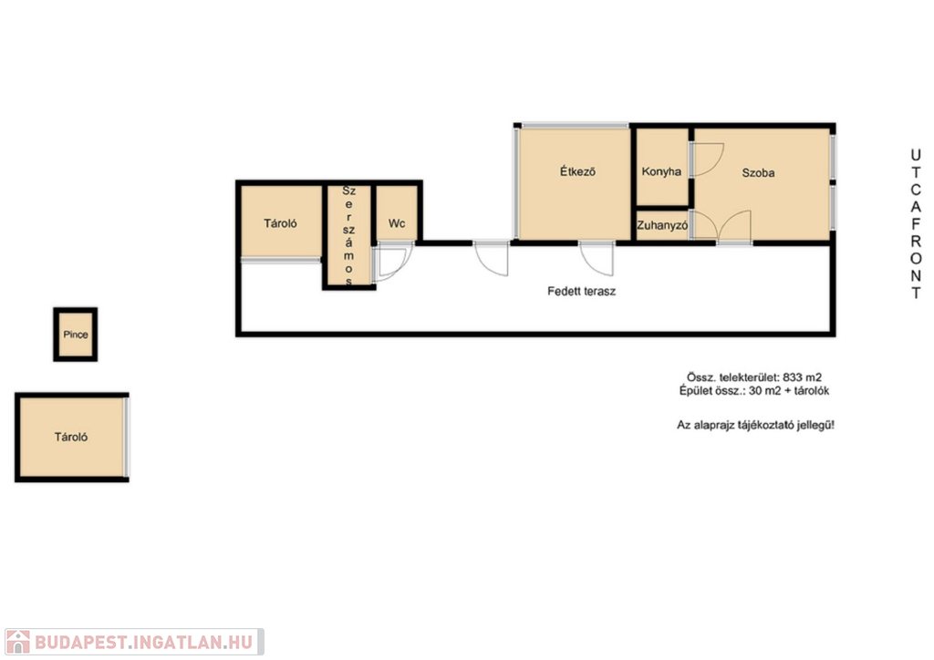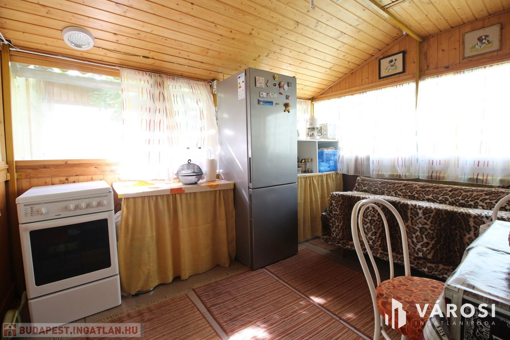 A telken található épület, beton alapon álló zártszelvény vázas, szigetelt faház. Vezetékes víz, villany a házban, gázcsatlakozási lehetőség az utcában, valamint kábeltévé és internet is elérhető. A ház konyhával és zuhanyzóval rendelkezik, külön helyiségben vízöblítéses wc van, de jelenleg fűtés hiányában állandó lakás céljára nem alkalmas. A fő épületet, katonás rendben, felcímkézett dobozokkal bepakolt tárolók és szerszámos helyiség egészíti ki, valamint egy betonozott falú pince és szintén betonozott falú komposztáló.