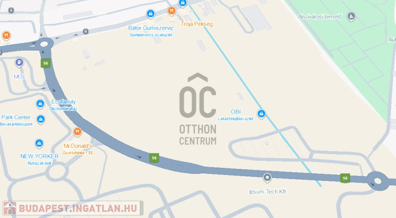 Az ingatlan a város déli kereskedelmi negyedében, forgalmas helyen, közvetlenül az 56-os főút mellett helyezkedik el. Ez közvetlen kapcsolatot teremt a 6. számú főúttal, valamint az M9 autópályán át az M6 autópályával. A telek közelében Park Center üzletközpont, Lidl áruház, OBI barkácsáruház, Penny Market és TESCO áruházak, valamint Mc Donalds Étterem és MOL kút van. A beépítéshez szükségek közművel az ingatlan előtti közterületen rendelkezésre állnak. A terület kivett beruházási területként nyilvántartott.