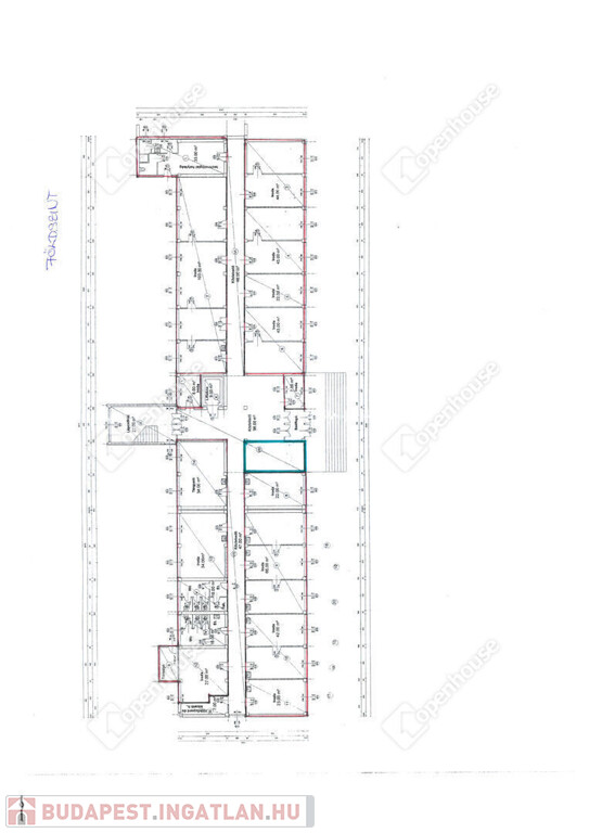 Földszint bal oldal: 14 db fél szoba amik egy ágyasak, 4 db nagy szoba melyek 2 ágyasak. Kazánház, konyha, 2 mosdó, melyekben 4 tusoló, 5 wc, és 3 piszoár található.