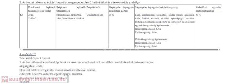 A részben sík terület Lf övezeti besorolású, melynek jogszabály szerinti legnagyobb beépíthetősége 30 %.