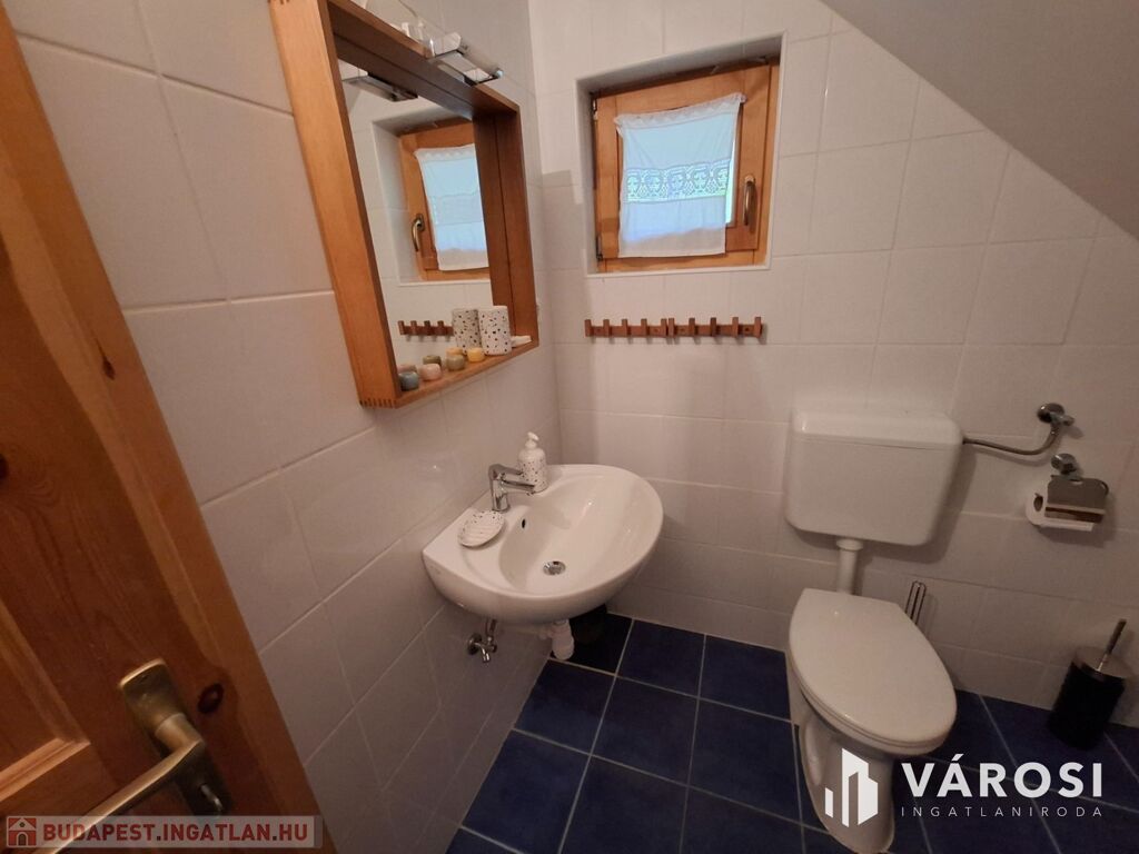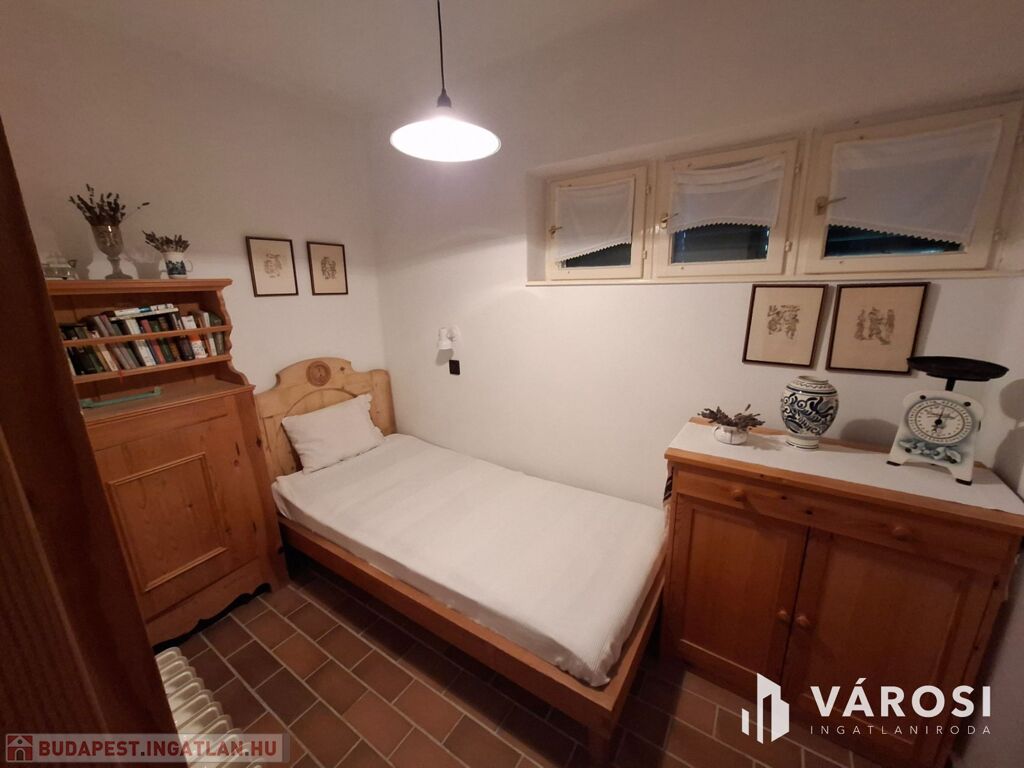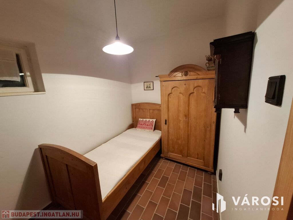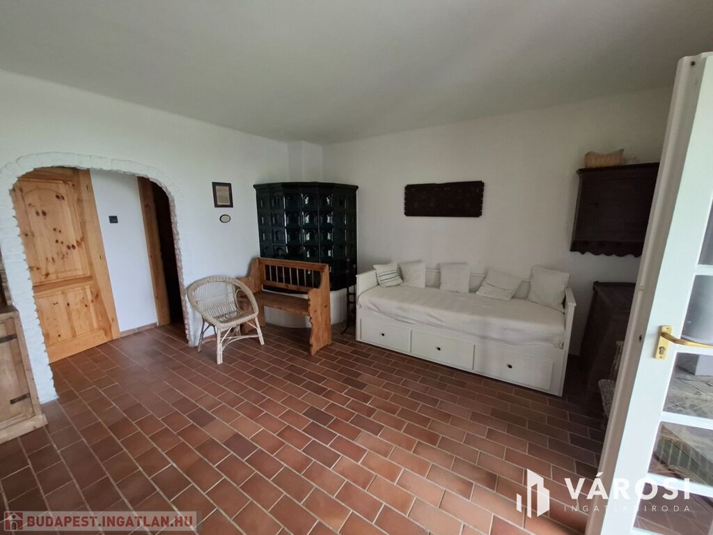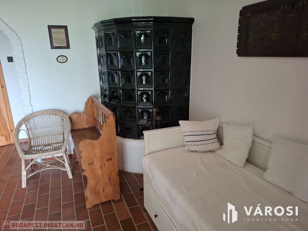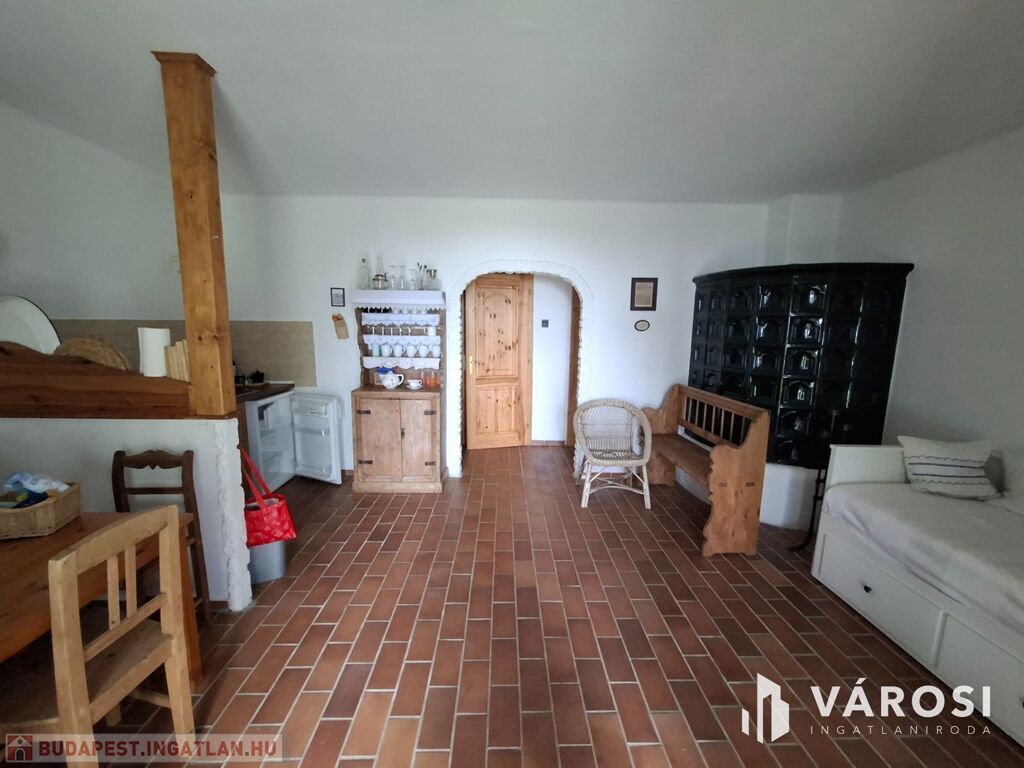 Az alsó részen fedett kocsibeálló, kerti sütő és pihenőterasz található; az épületben amerikai konyhás nappali, fürdőszoba és két félszoba van, cserépkályhával fűtve.
