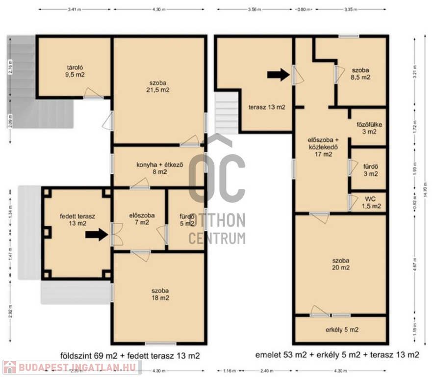 - A külső lépcsőn elérhető felső szint 53 m2-es, ahol szintén kettő szoba, előszoba, WC, fürdő, főzőfülke, erkély és terasz került kialakításra.