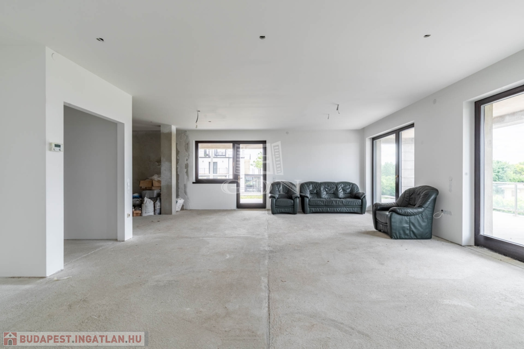 A 112 nm-es nettó alapterületű emeleten 1 nappali (kandalló előkészítéssel), 3 szoba, 2 fürdőszoba, valamint 101 nm-es részben fedett és pergolás körpanorámás terasszal.