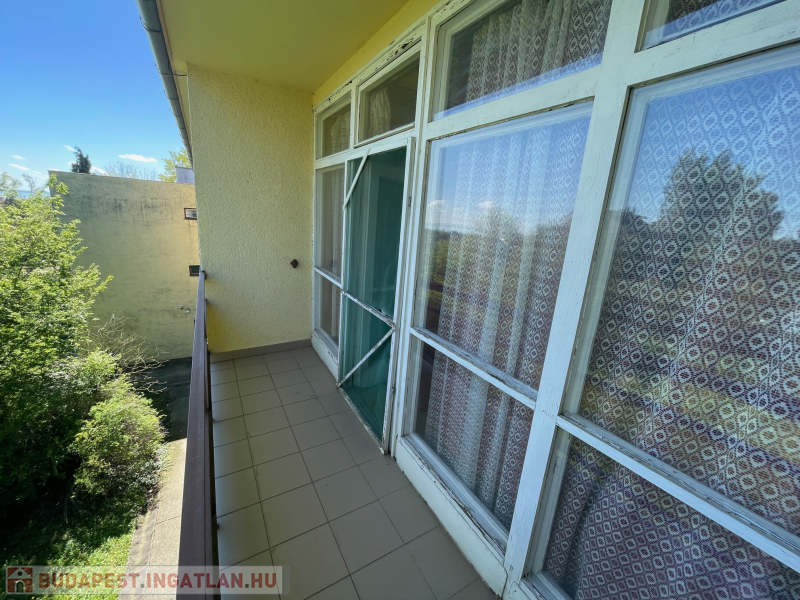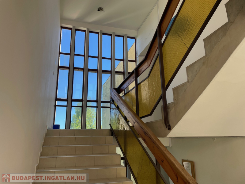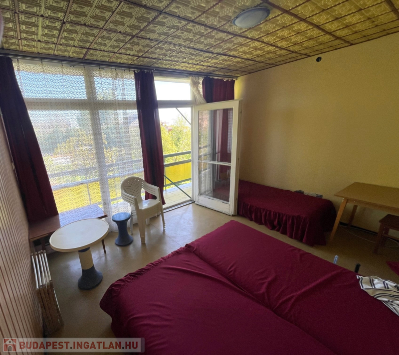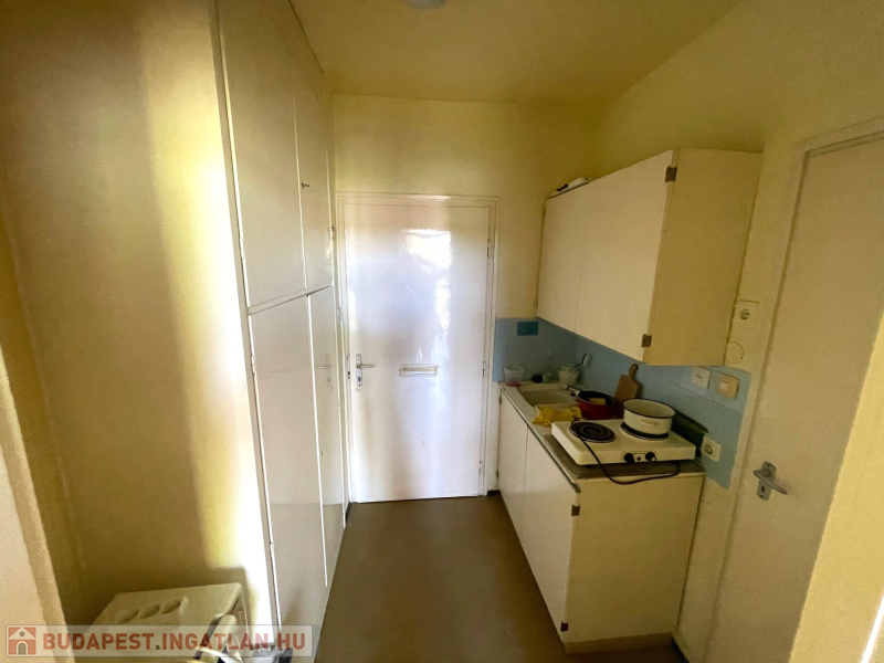 Az egyszobás, mini garzon méretű lakrész: teakonyha, kádas fürdőszoba + WC, lakószoba,8 m2-es erkély elosztású.