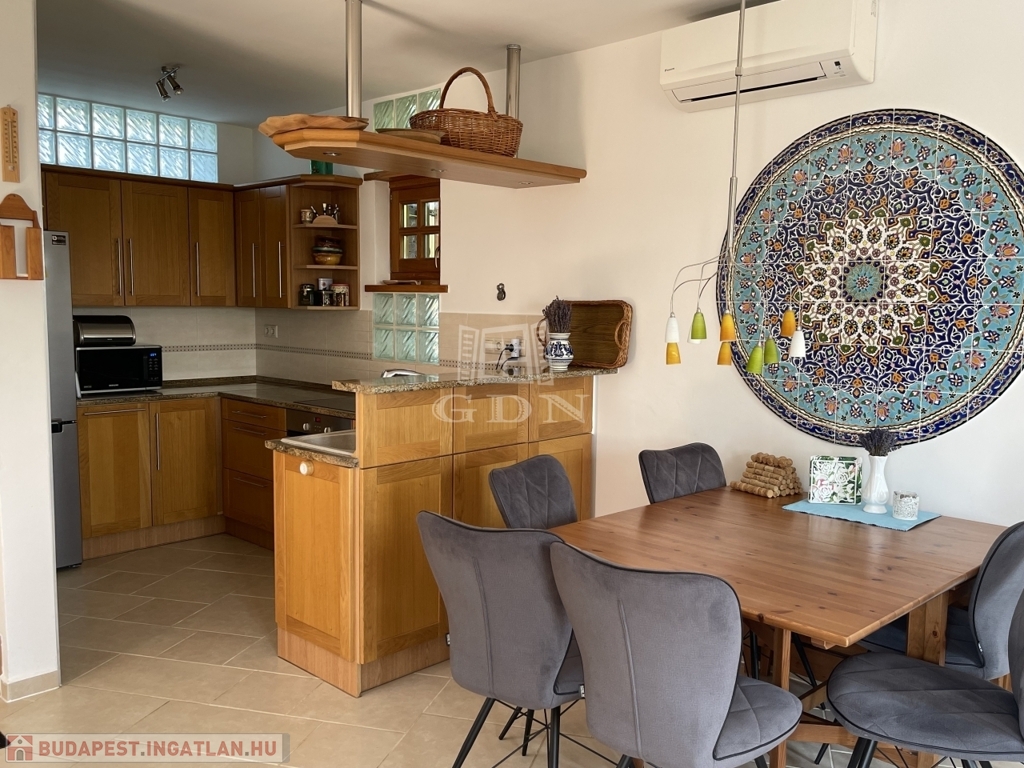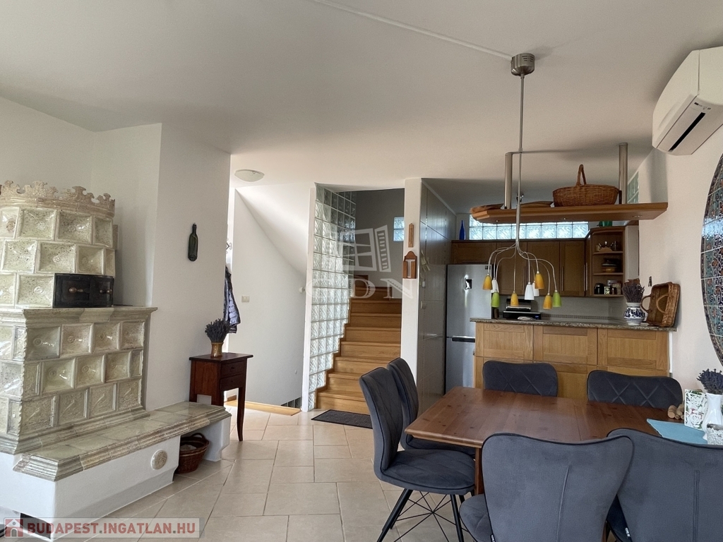 Fűtés: a föld alatti 5 m3-es propángáz tartály biztosítja a padlófűtést minden szinten, a nappaliban cserépkályha sütőfunkcióval, split klímák, a fürdőkben plusz törölközőszárító radiátorok.