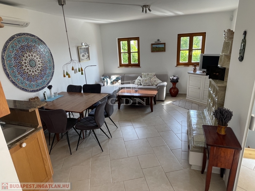 Földszint: nappali + étkező (19,8 m²) + konyha (7,2 m² ) légtérben split klímával, vendégszoba (8,9 m²) + zuhanyzós fürdő (2,4 m²)