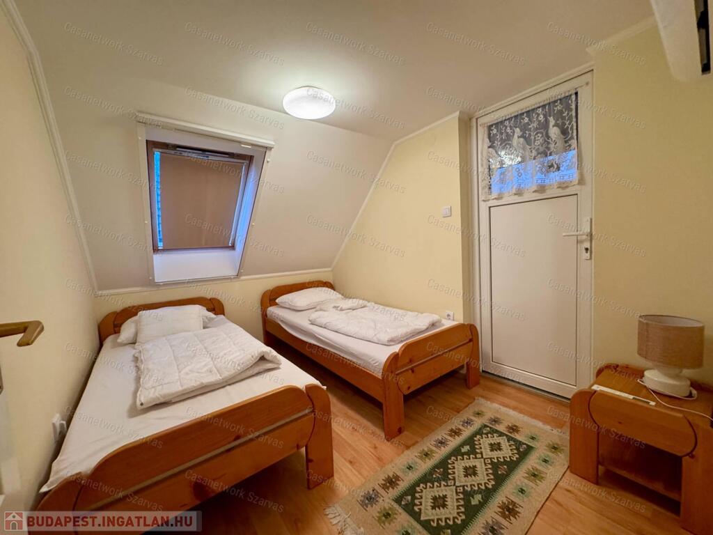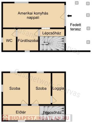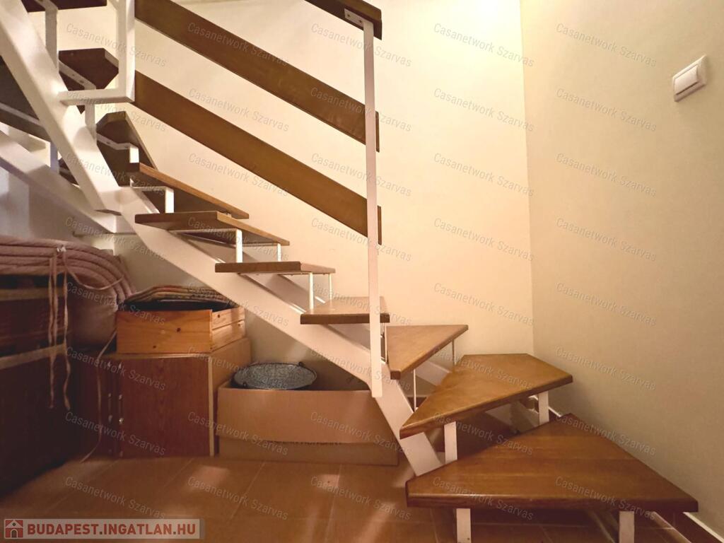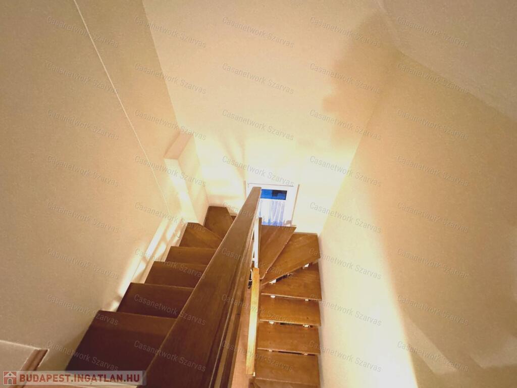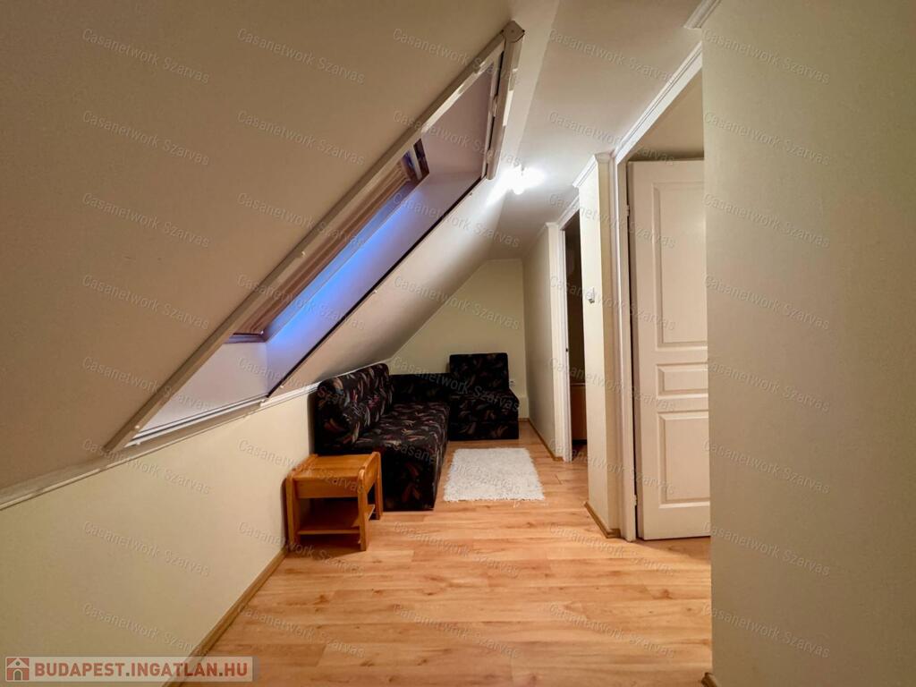 - Az ingatlan tetőterén folytatódik a lépcsőház, valamint kialakításra került egy előtér, két szoba és egy loggia szerkezet.