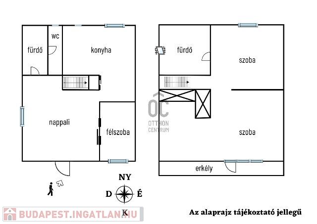 Földszint: nappali, félszoba, konyha, fürdő káddal, külön WC, terasz.